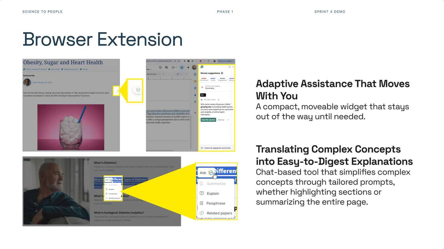Companion Product: The Browser Extension is a lightweight research companion that integrates seamlessly into creators’ existing workflows - offering real-time research assistance and simplified translations of complex health concepts without disrupting creative flow.