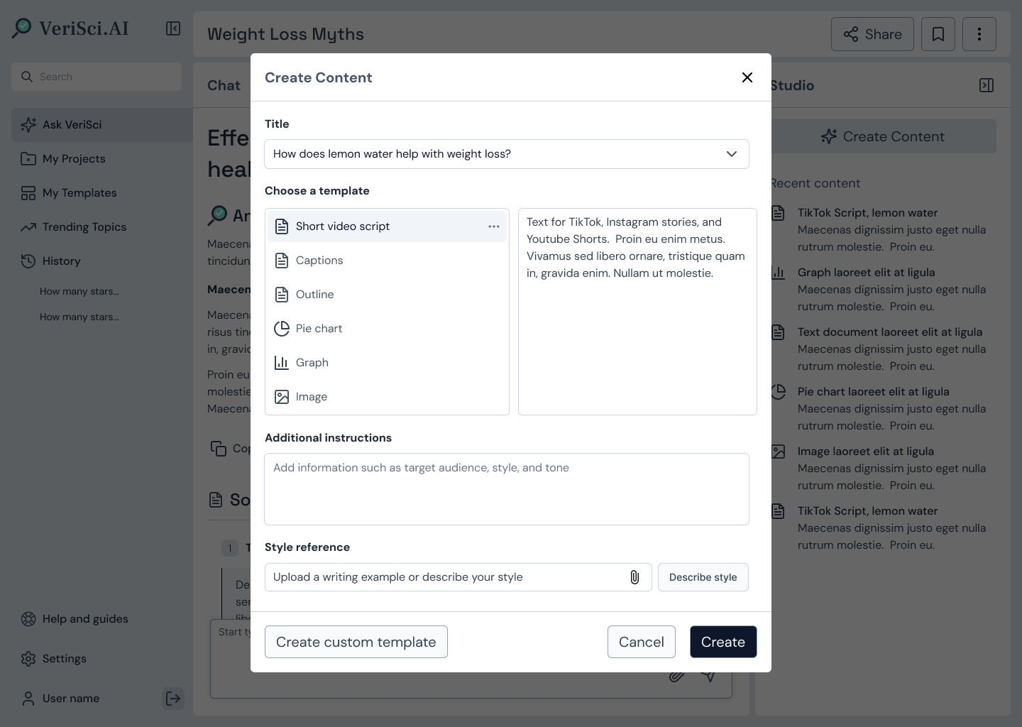 VeriSci V3 (now called Akari) is an AI-powered content creation studio that helps health and wellness content creators generate engaging, fact-based content effortlessly by unobtrusively streamlining research, ensuring accuracy, and adapting to their personal tone of voice. Our final recommendation to Science to People included a desktop platform and a complimentary Browser Extension.