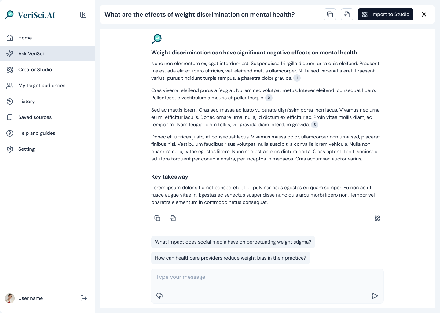 Our team was tasked with building the 3rd variation of VeriSci for content creators - translating this simple chat interface into an AI-powered SaaS product. As stated by the CEO: "An AI-powered platform that is better educated than ChatGPT, trained to think like a public health expert, and writes like an influencer."